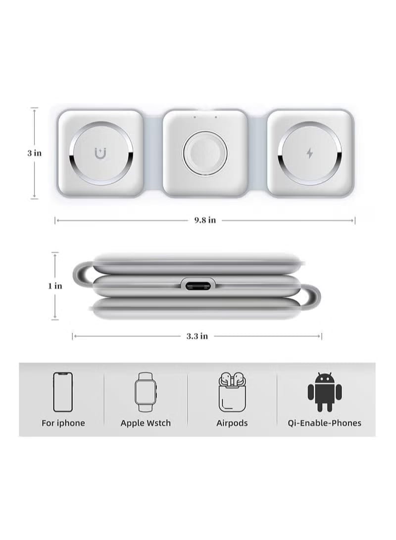 Power up your Apple devices effortlessly with this sleek 3-in-1 Magnetic Wireless Charger. Designed for convenience and speed, it wirelessly charges your iPhone, Apple Watch, and AirPods simultaneously. Featuring a foldable design, it’s perfect for both home use and travel. The strong magnetic alignment ensures secure attachment and efficient charging every time.